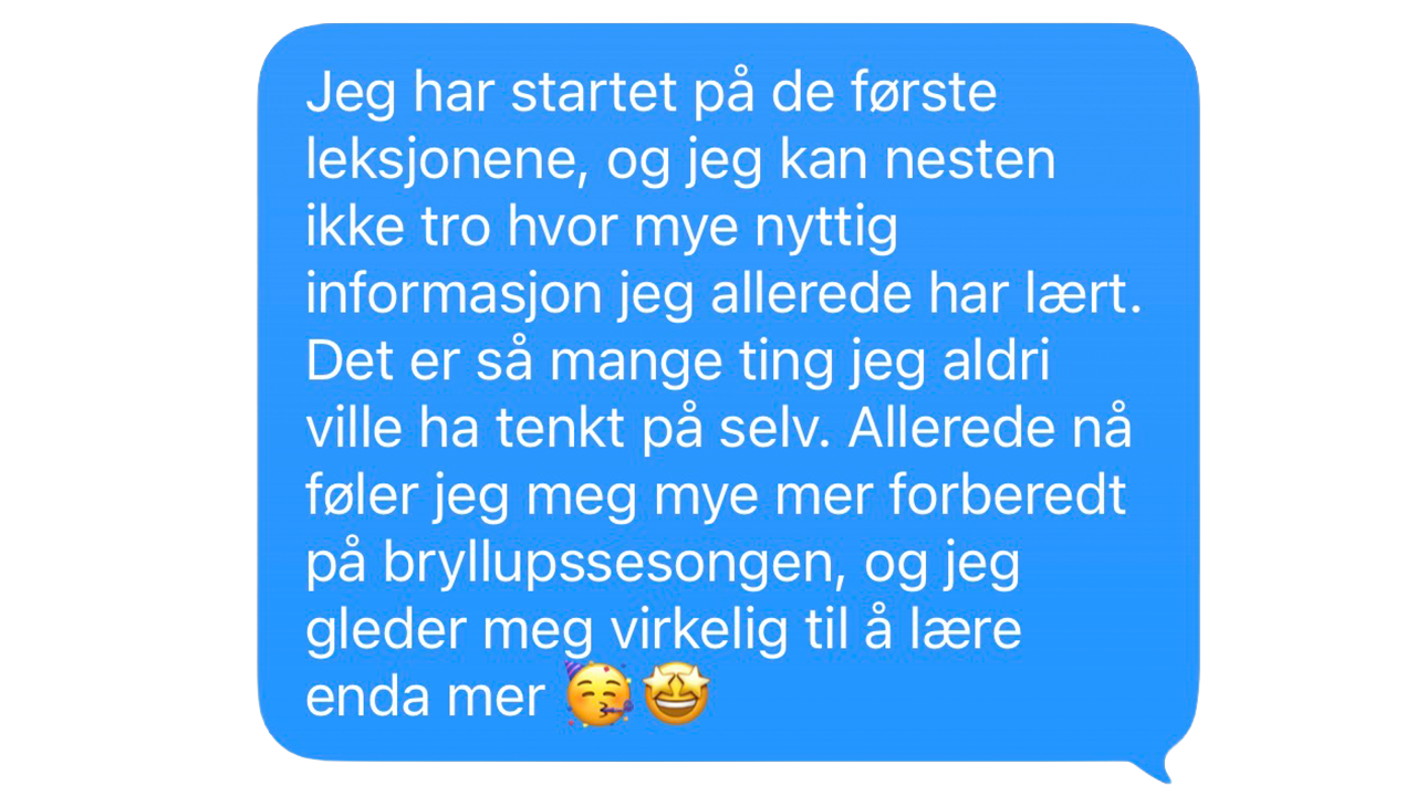 Vi går gjennom prising, kundeservice, kontrakter og hvordan du tiltrekker deg riktige kunder. Du lærer å stå trygt i verdien din og bygge en bærekraftig og lønnsom karriere som bryllupsfotograf.